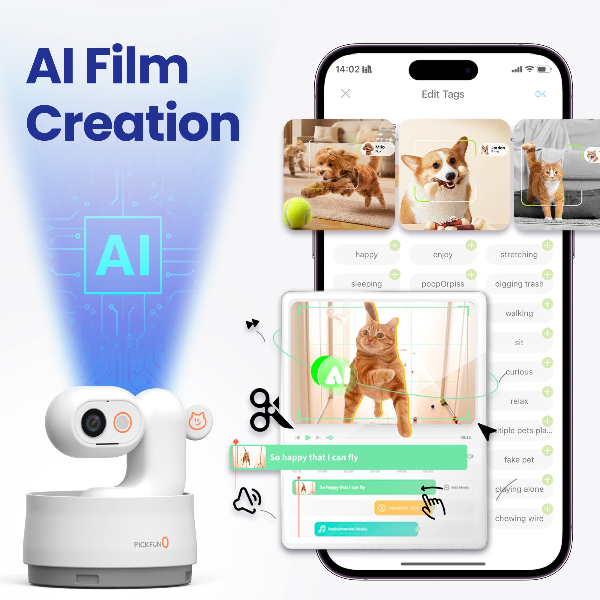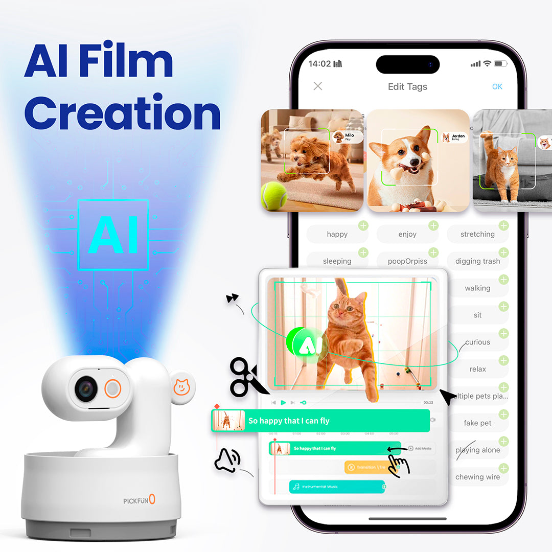 PickFun’s AI automatically records your pet’s activities and turns the best moments into short daily clips. It identifies behaviors, adds simple music and captions, and sends you highlights through the app — helping you relive your pet’s day without lifting a finger.